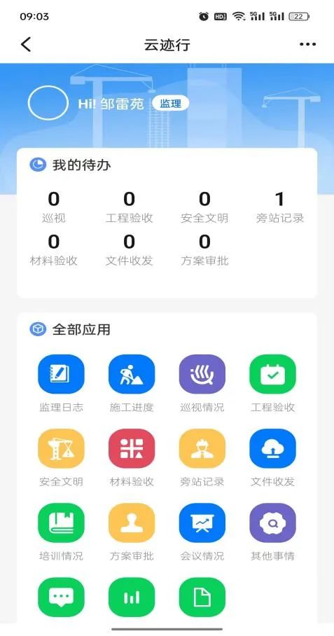 针对建筑行业数字化转型的趋势和潮流,我公司自主研发了监理项目管理软件“云迹行”,在2021年5月份正式上线。“云迹行”软件包含了施工进度情况、巡视情况、工程验收、安全文明管理、材料设备验收、旁站记录、文件收发情况、方案审批等多个模块,基本上覆盖了日常监理工作的所有范围和控制点。软件上线以来使用效果较为理想,为公司数字化监理转型和推广起到了至关重要的作用。