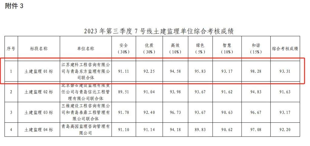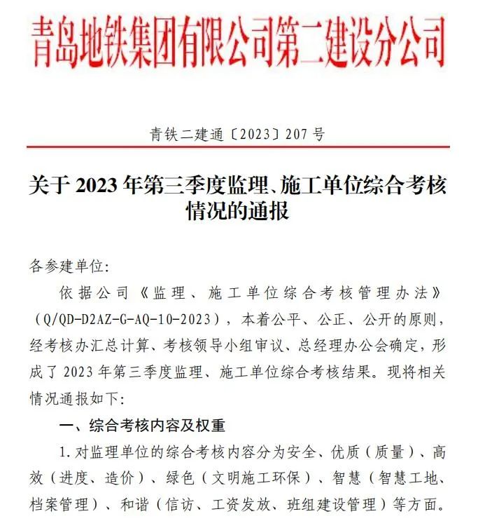 会上,对第三季度各参建方考核成绩优秀单位进行了表彰。本季度青岛地铁7号线监理部在第二建设分公司《2023年第三季度土建监理单位信用考核》中排名第一,2023年度连续三季度信用考核成绩优异,获得“优秀监理部”称号。